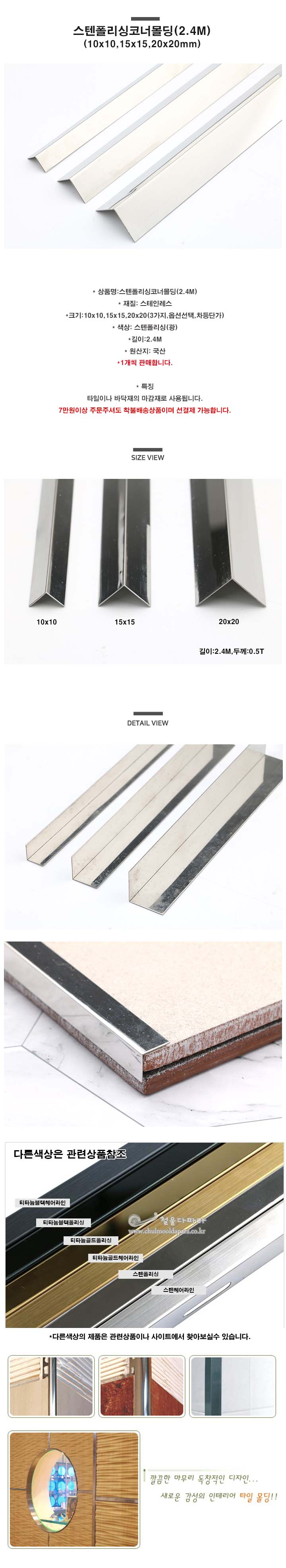 > 스텐코너몰딩(폴리싱)(10x10,15x15,20x20)(코너몰딩/코너비드/꼼꼼이/타일몰딩/스텐몰딩/스텐코너비드/재료분리대/ㄱ자코너몰딩/ㄱ자재료분리대/타일몰딩)